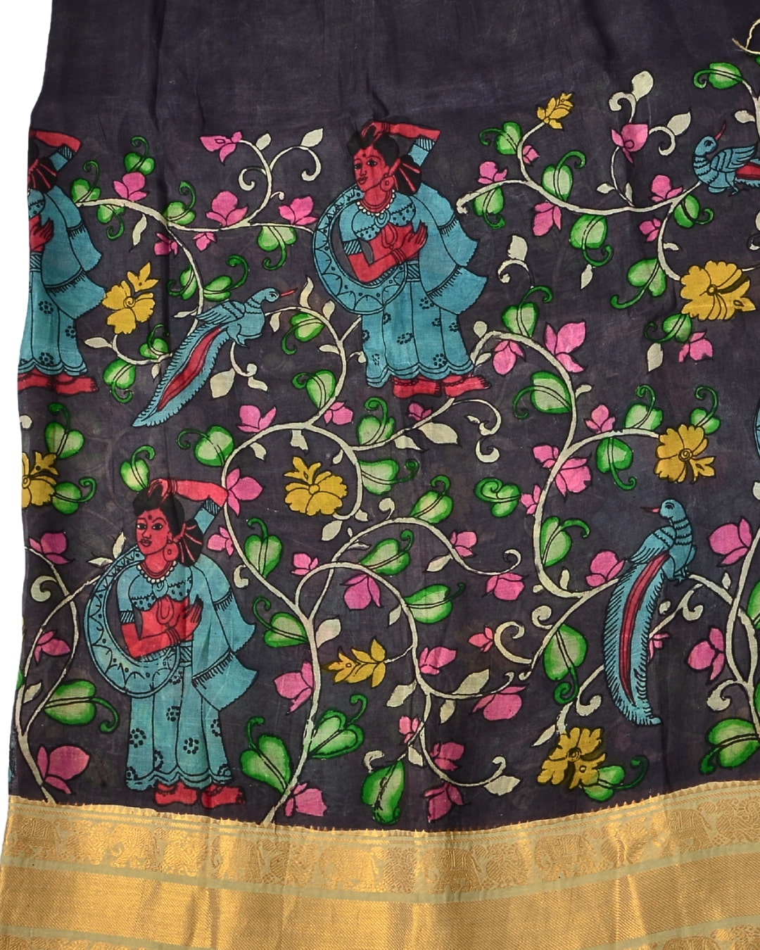 An exquisite hand-painted Pen Kalamkari Bangalore silk saree, adorned with intricate mythological and floral motifs.