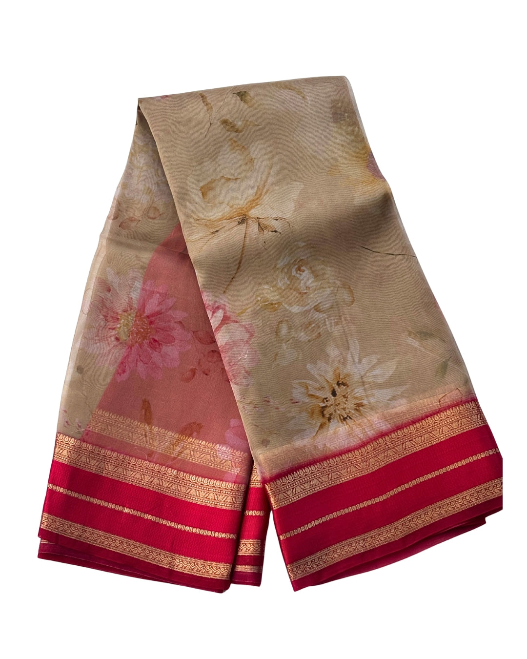 A love letter to vintage elegance. 🍂 This Pure Organza drape pairs a soulful beige canvas with bold, watercolor blooms in soft pinks and whites. The look is dramatically framed by a rich red Zari border, creating a timeless and sophisticated contrast that demands attention.